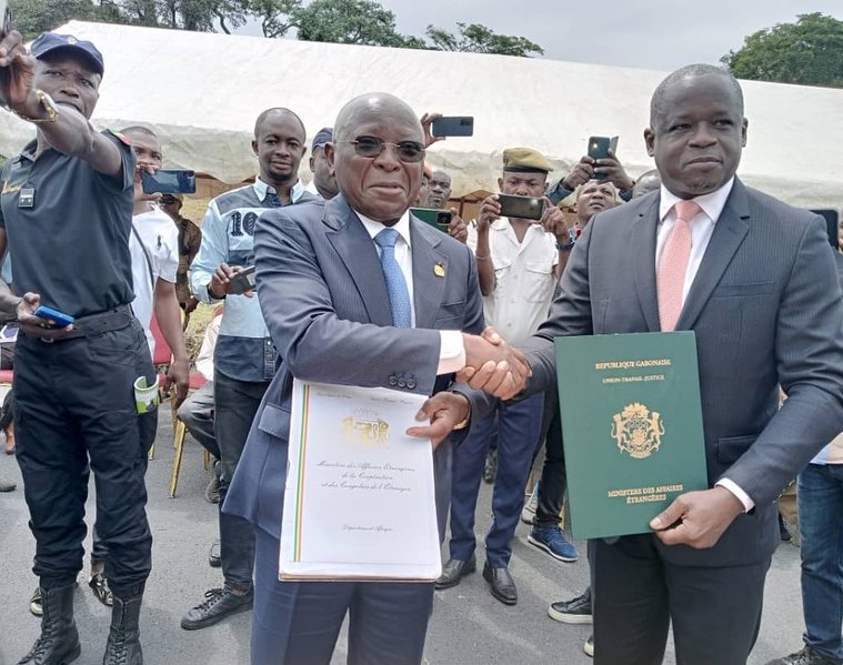 Le mardi 19 décembre 2023, le Ministre Délégué auprès du Président de la Transition, M. Hermann IMMONGAULT, a marqué une étape historique en signant un protocole d’accord à Kabala, à la frontière entre le Gabon et le Congo, avec son homologue Congolais, Raymond Zéphirin MBOULOU, ministre de l’Intérieur, de la Décentralisation et du Développement Local.