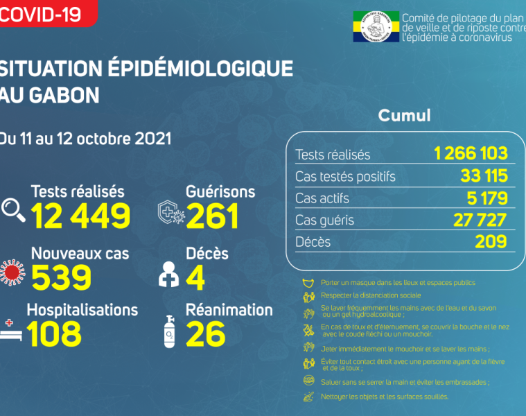 Gabon Matin vous livre le point journalier du Comité de pilotage du plan de veille et de riposte contre l’épidémie à Coronavirus au Gabon du 12 octobre 2021.