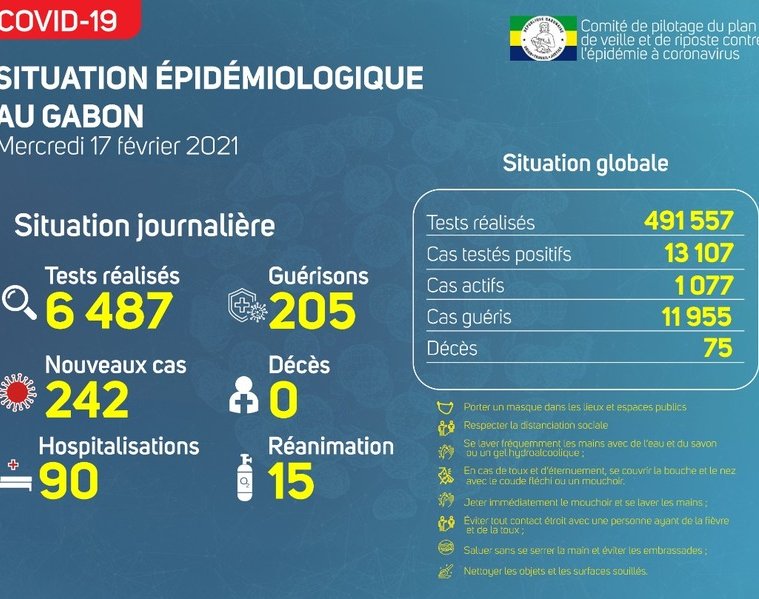 Gabon Matin vous livre le point journalier du Comité de pilotage du plan de veille et de riposte contre l’épidémie à Coronavirus au Gabon du 17 février 2021.