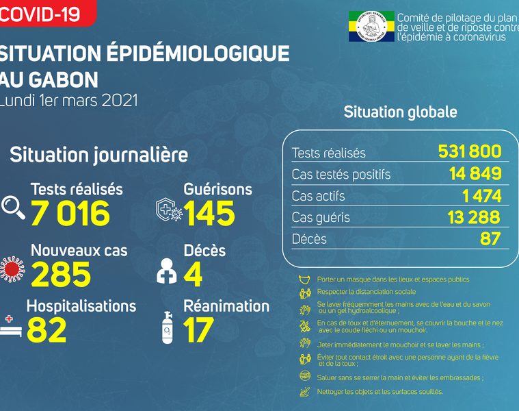 La situation sanitaire de la pandémie de la COVID-19 reste préoccupante. Nous avons enregistré 285 nouveaux cas positifs sur 7 016 prélèvements, soit un taux de positivité de 4%. Le nombre de personnes hospitalisées est de 82 dont 17 en réanimation pour détresse respiratoire et nous avons enregistré 04 nouveaux décès à Libreville. Le nombre de guérisons est de 145 et le nombre de cas actifs 1 474.