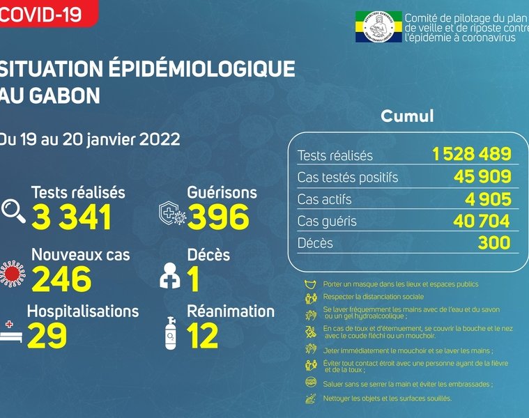 GabonMatin vous livre le point journalier du Comité de pilotage du plan de veille et de riposte contre l’épidémie à Coronavirus au Gabon du 20 janvier 2022.