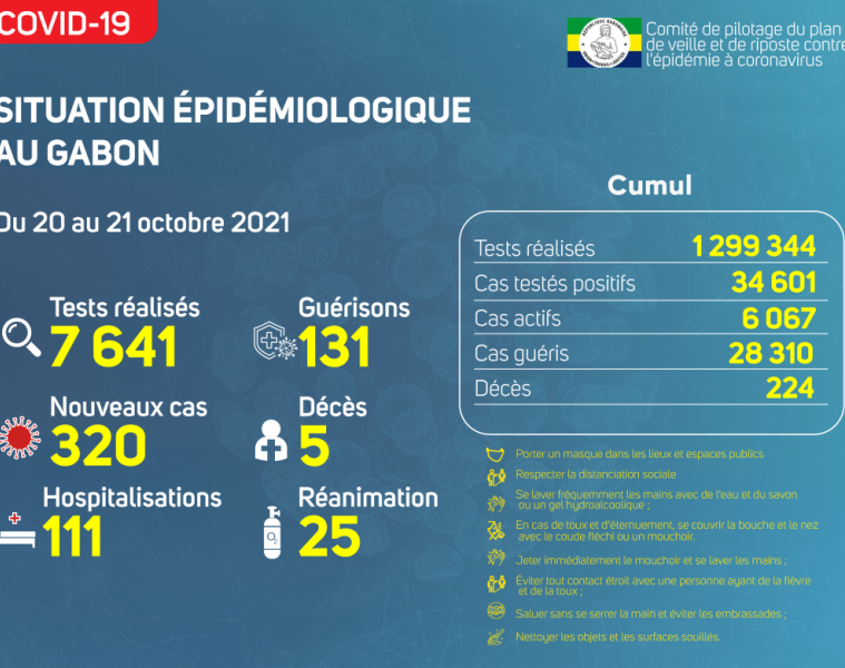 Nous avons enregistré 320 nouveaux cas positifs sur 7 641 tests réalisés, soit un taux de positivité de 4.2%, 111 personnes hospitalisées dont 25 en réanimation pour détresse respiratoire, 131 nouvelles guérisons et 05 nouveaux décès dont 04 à Libreville et 01 à Tchibanga.