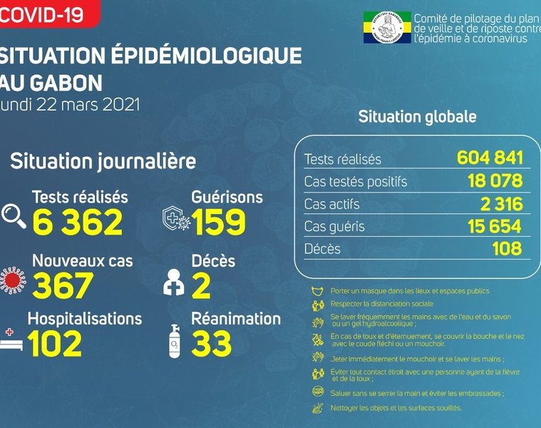Nous avons enregistré 367 nouveaux cas positifs sur 6 362 tests réalisés, soit un taux de positivité de 5,7%, 102 personnes hospitalisées dont 33 en réanimation pour détresse respiratoire, 159 guérisons et 02 nouveaux décès notifiés à Libreville.