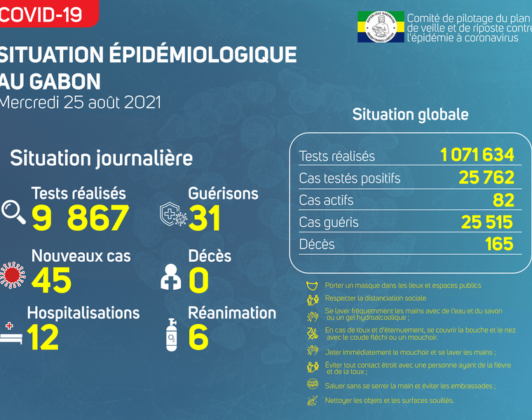 Gabon Matin vous livre le point journalier du Comité de pilotage du plan de veille et de riposte contre l’épidémie à Coronavirus au Gabon du 25 août 2021.