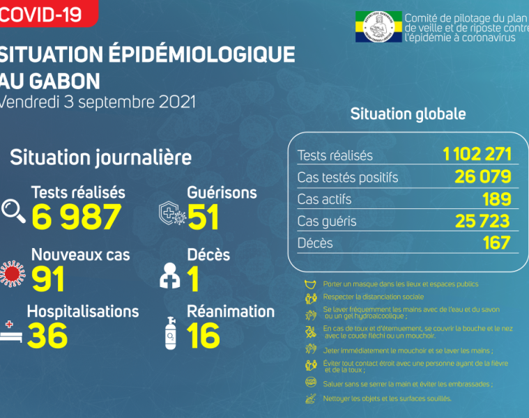 Nous avons enregistré 91 nouveaux cas positifs sur 6 987 tests réalisés, soit un taux de positivité de 1.3%, 36 personnes hospitalisées dont 16 en réanimation pour détresse respiratoire, 51 nouvelles guérisons et 01 nouveau décès à Libreville.