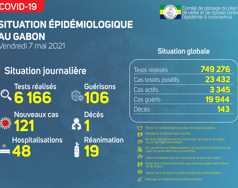 Nous avons enregistré 121 nouveaux cas positifs sur 6 166 tests réalisés, soit un taux de positivité de 1.9%, 48 personnes hospitalisées dont 19 en réanimation pour détresse respiratoire, 106 nouvelles guérisons et 01 nouveau décès à Libreville.