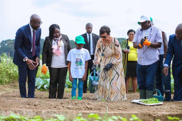 Pour clore cette cérémonie de lancement de l’édition 2019 des vacances agricoles, Mesdames Sylvia Bongo Ondimba et Augustine Nkoghe Bekale accompagnées du ministre Biendi Maganga Moussavou et des vacanciers ont pris part à deux activités de planting et de récolte de laitue.